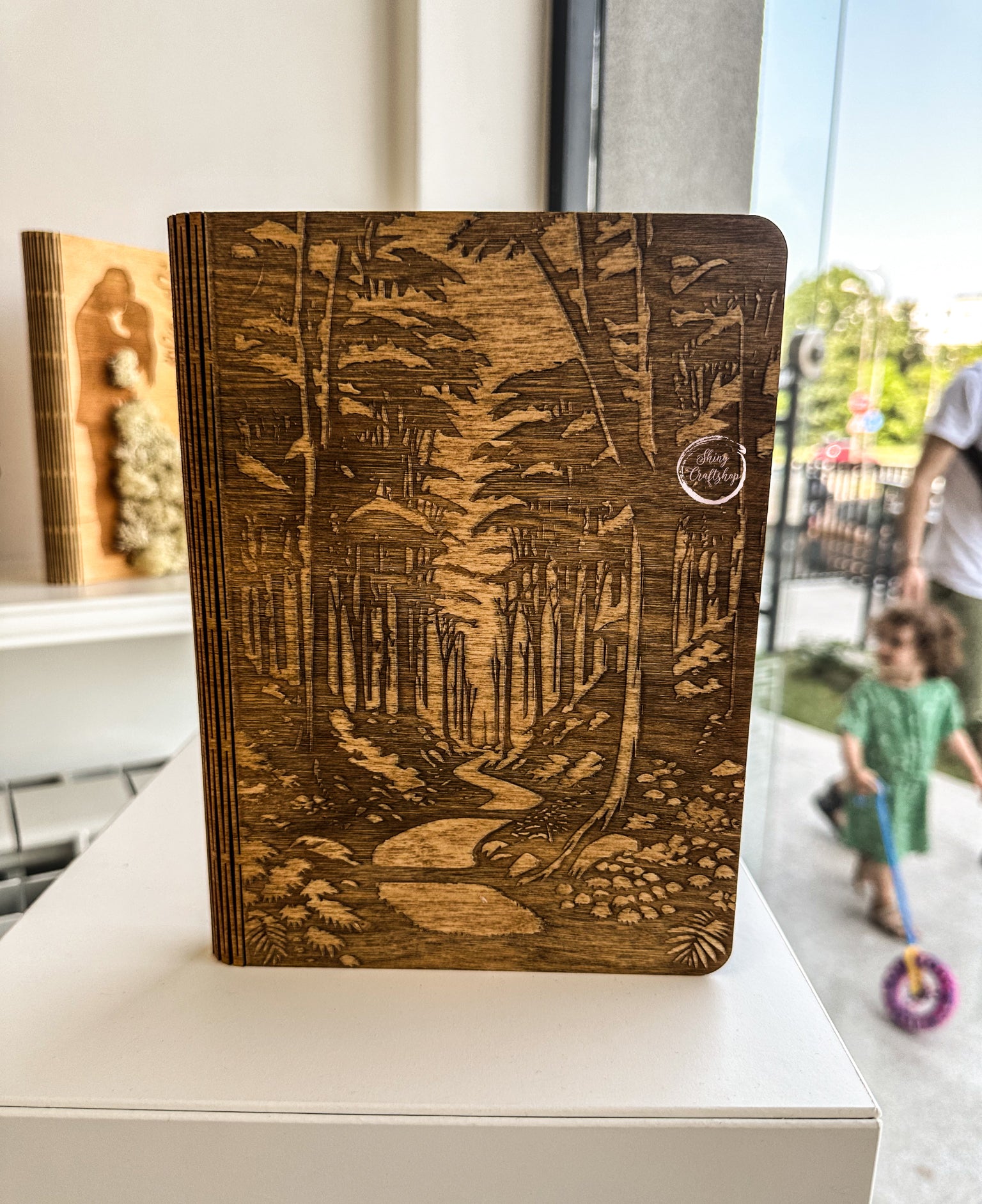 Дървена картичка за юбилей с лазерно гравиране и декорация от скандинавски мъх. Перфектен подарък за специални поводи с персонален акцент.