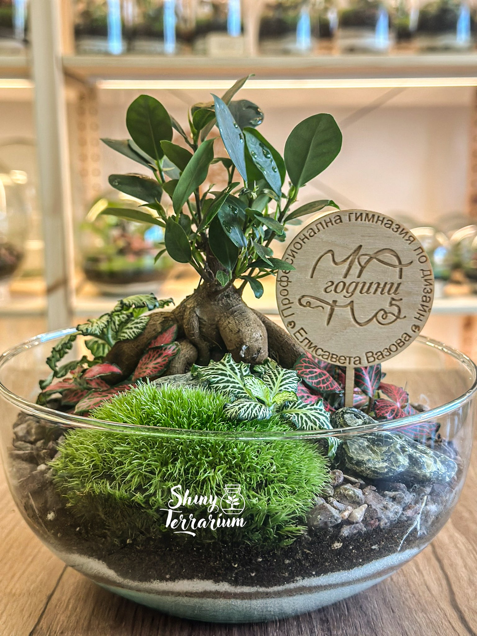 Терариум "Стъклена Сфера" (Ø 19см) е затворена мини-екосистема с фикус женшен, фитония и горски мъх – луксозен подарък.